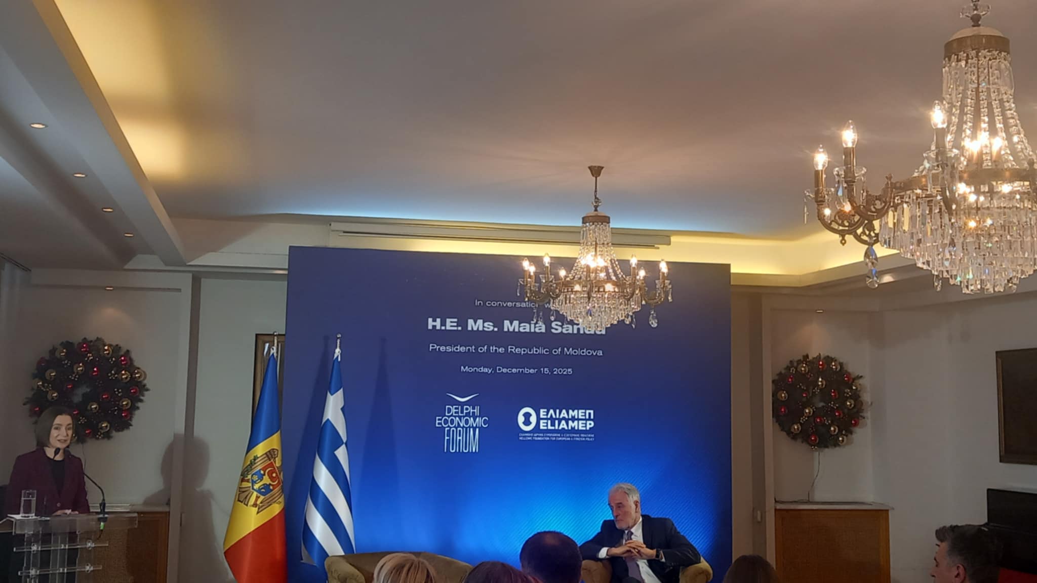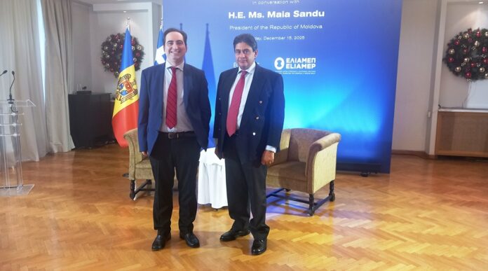 Στο πλαίσιο της επίσημης επίσκεψης εργασίας της Α.Ε. Προέδρου της Δημοκρατίας της Μολδαβίας Maia Sandu, στην Αθήνα, το ΕΛΙΑΜΕΠ, σε συνεργασία με το Delphi Economic Forum, διοργάνωσε κλειστή εκδήλωση στις 15 Δεκεμβρίου 2025 στην Αθηναϊκή Λέσχη με προσκεκλημένη την Μολδαβή ΠτΔ. Κατά τη διάρκεια της εκδήλωσης στην οποία συμμετείχαν εκπρόσωποι από τον πολιτικό, διπλωματικό, ακαδημαϊκό και επιχειρηματικό κόσμο συζητήθηκαν θέματα όπως οι υβριδικές απειλές, η ευρωπαϊκή προοπτική της Μολδαβίας και η διμερής οικονομική και ενεργειακή συνεργασία Ελλάδας και Μολδαβίας. Τη συζήτηση συντόνισαν ο Καθηγητής Λουκάς Τσούκαλης, Πρόεδρος Δ.Σ. του ΕΛΙΑΜΕΠ, και ο κ. Συμεών Τσομώκος, Ιδρυτής και Πρόεδρος του Delphi Economic Forum. Το Κέντρο Διεθνών Στρατηγικών Αναλύσεων (ΚΕΔΙΣΑ) εκπροσωπήθηκε στην κλειστή εκδήλωση από τον Ιδρυτή & Πρόεδρο Δ.Σ. Δρ. Ανδρέα Γ. Μπανούτσο και τον Αντιπρόεδρο Δ.Σ. και Διευθυντή Ερευνών Δρ. Παναγιώτη Σφαέλο.